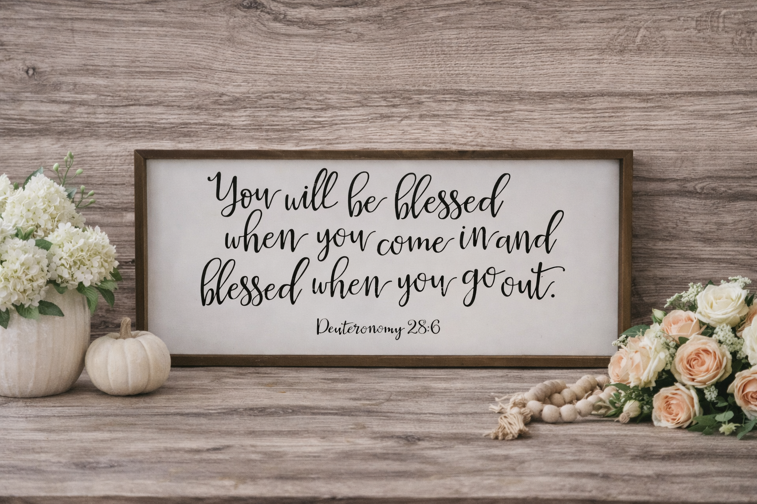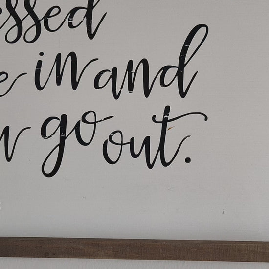 Create a peaceful, welcoming atmosphere in your home with this beautifully framed scripture sign inspired by Deuteronomy 28:6: