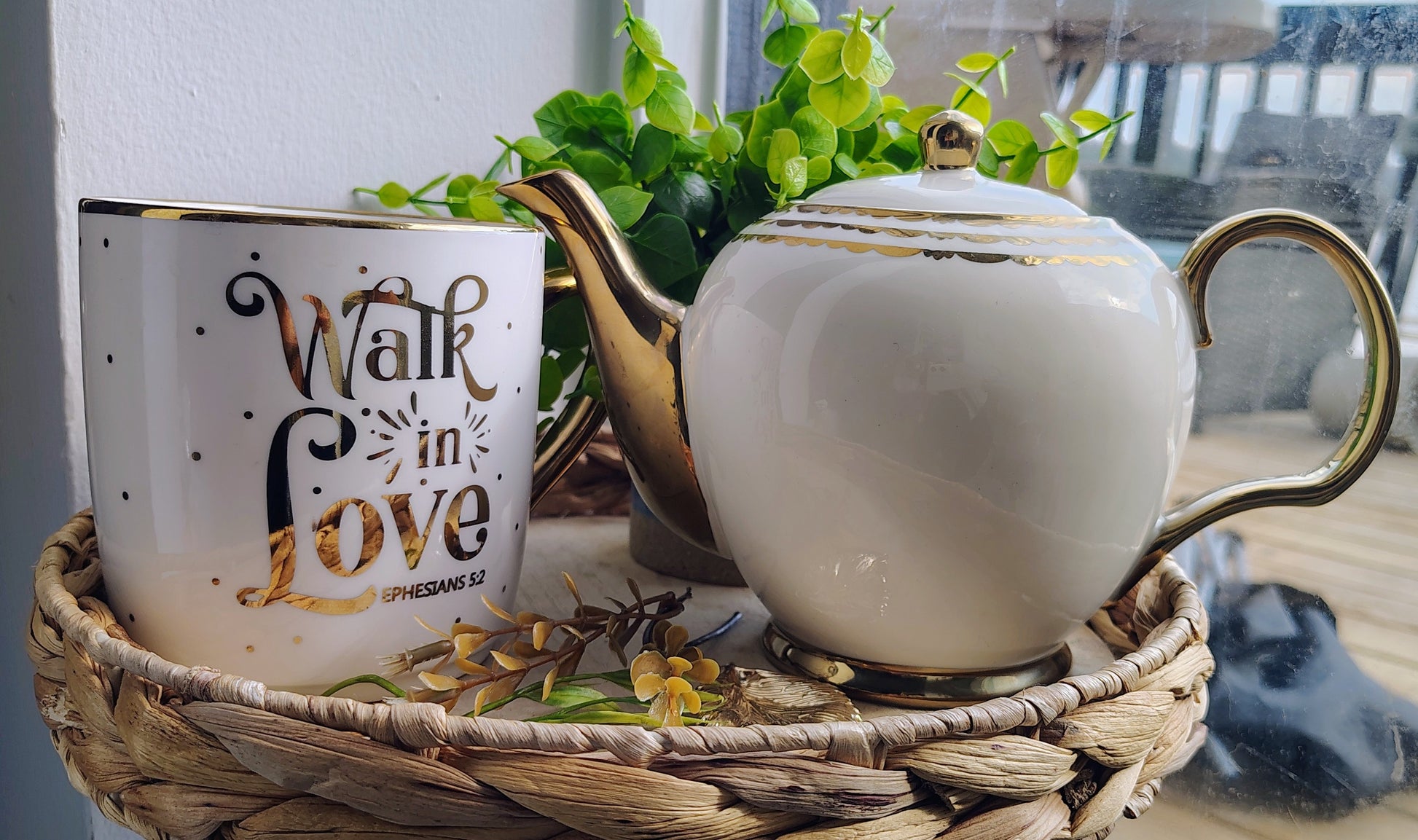 Walk in Love Tea Set – Ephesians 5:2 Gold Teapot & Matching Encouragement Mug | Scripture Tea Gift Set